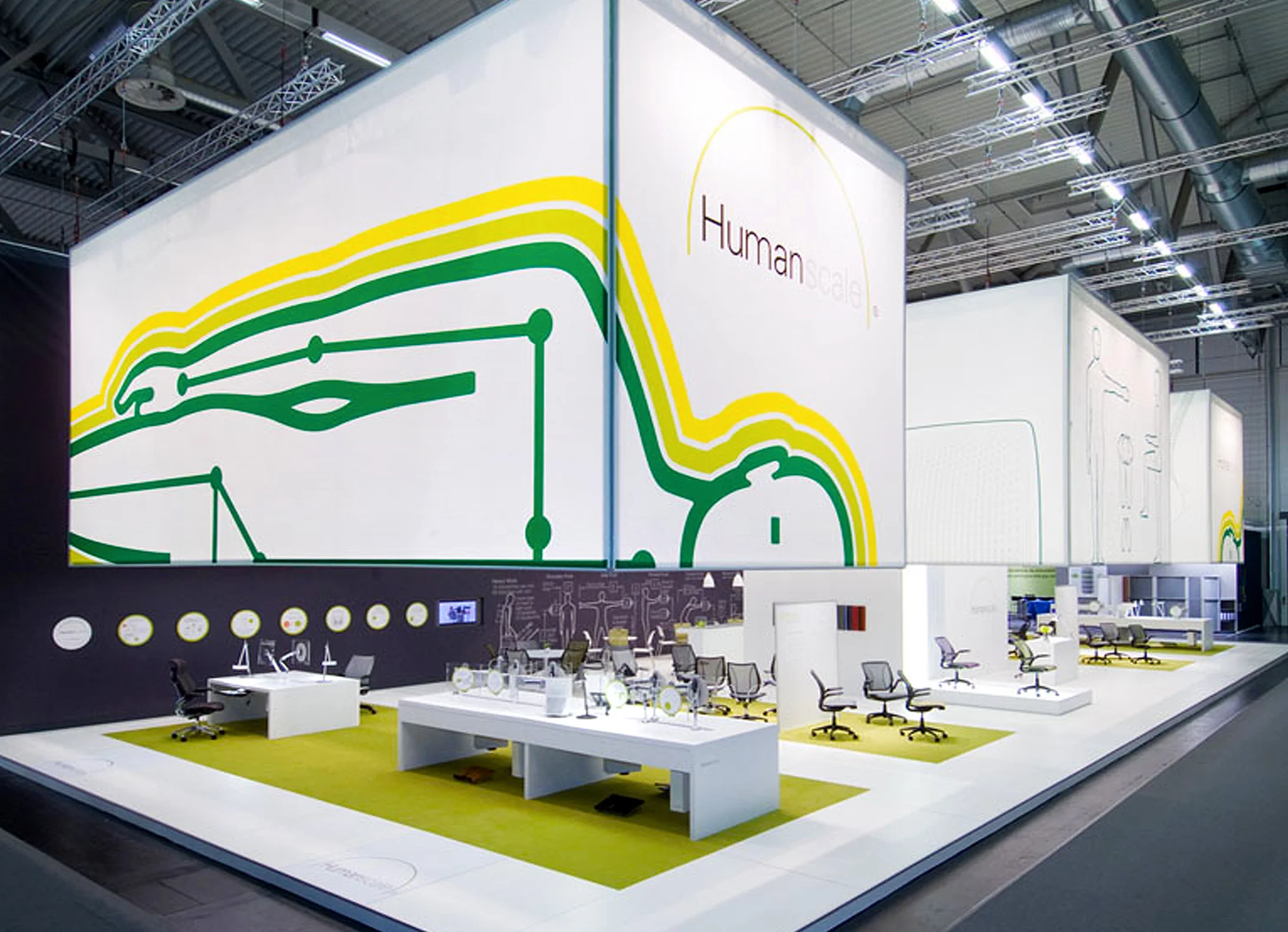 To develop and produce an exhibition stand to showcase the latest HumanScale ergonomic office furniture range, at Europe’s largest Bi Annual Furniture Show in Cologne. We draw on the company’s history of research and we revisited the imagery from the 70’s definitive guide to human anthropometry that changed the face of Industrial Design and ushering in the age of human-centric design.