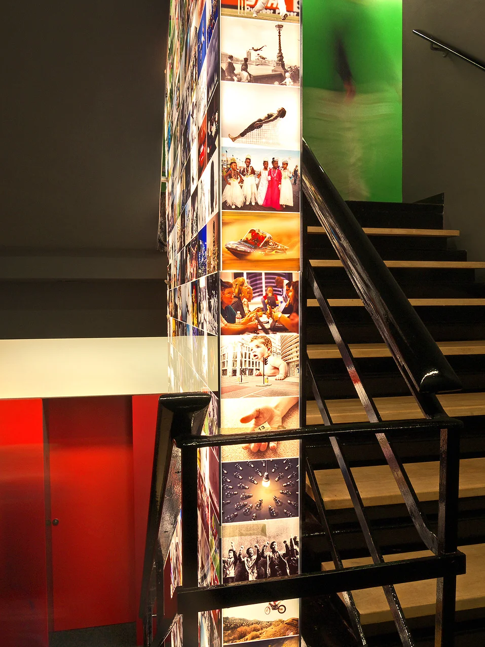 The centrepiece of the interior refurbishment project is the 20 metre vertically suspended 360° Light-Feature, passing through each of the five floors of the London HQ building. Designed to showcase and illuminate the complex diversity of the modern Getty image collection in a digital flow and to encourage staff & visitors to use the stairs for a healthy working environment.